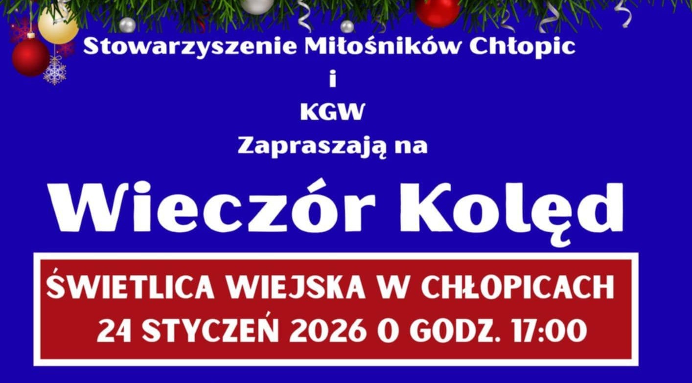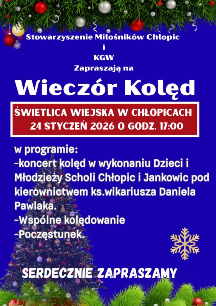 17 stycznia 2026 Stowarzyszenie Miłośników Chłopic i Koło Gospodyń Wiejskich zapraszają na Wieczór Kolęd, który odbędzie się w Świetlicy Wiejskiej w Chłopicach 24 stycznia 2026 r. o godzinie 17.00.